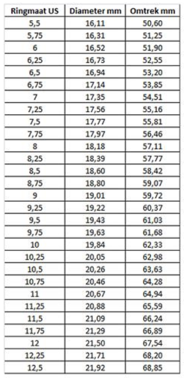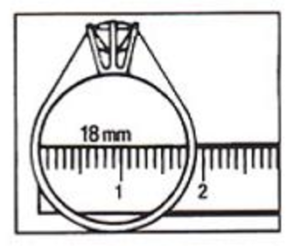 De ringmaat van de ring bepaald u zoals afgebeeld in de afbeelding aan de hand van een goed passende ring.